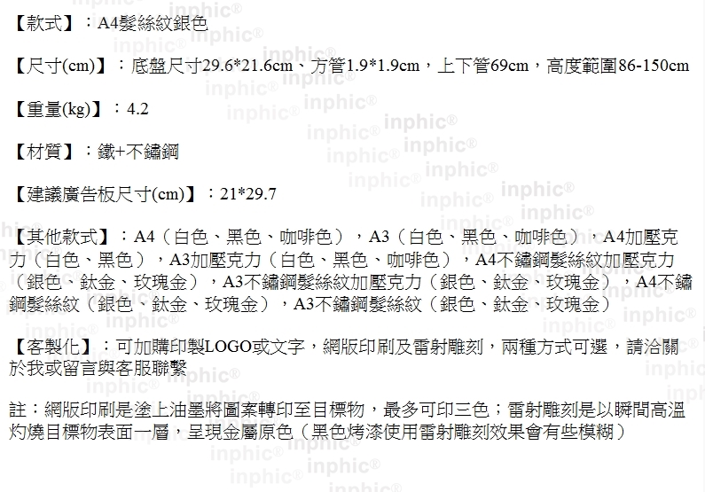 INPHIC-立牌 不鏽鋼髮絲紋展示牌 單腳海報架 拉絲看板 POP架 百貨賣場-A4銀色