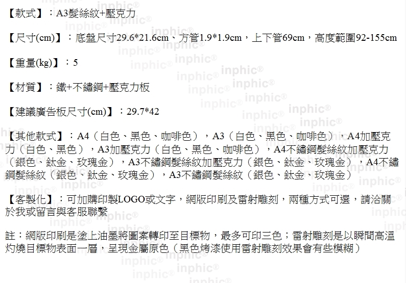INPHIC-海報架 單腳不鏽鋼髮絲紋拉絲立牌 展示牌 看板POP架 百貨賣場-A3+壓克力