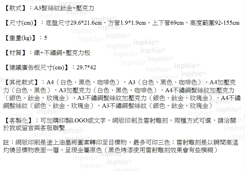 INPHIC-單腳海報架不鏽鋼髮絲紋拉絲看板 立牌 展示牌 POP架 百貨賣場-A3鈦金+壓克力