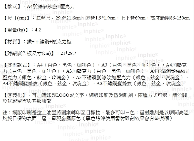 INPHIC-髮絲紋拉絲不鏽鋼立牌 展示牌  單腳海報架 看板 百貨賣場POP架-A4鈦金+壓克力