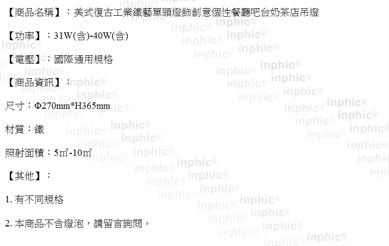 INPHIC- 美式復古工業鐵藝單頭燈飾創意個性餐廳吧臺奶茶店吊燈