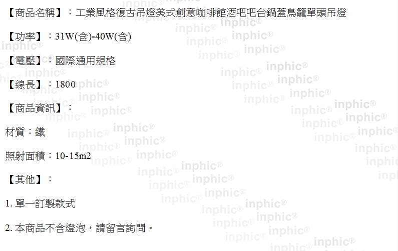 INPHIC- 工業風格復古吊燈美式創意咖啡館酒吧吧臺鍋蓋鳥籠單頭吊燈-P款